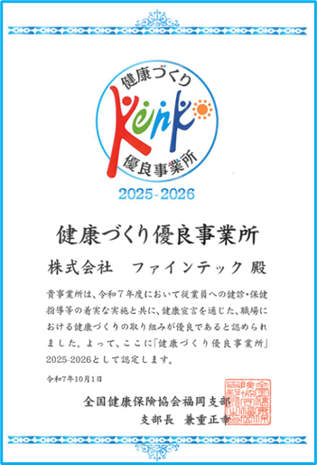 この度、ファインテックは全国健康保険協会福岡支部より健康づくりの取組みが優良であると認められ、「健康づくり優良事業所」に認定されました。